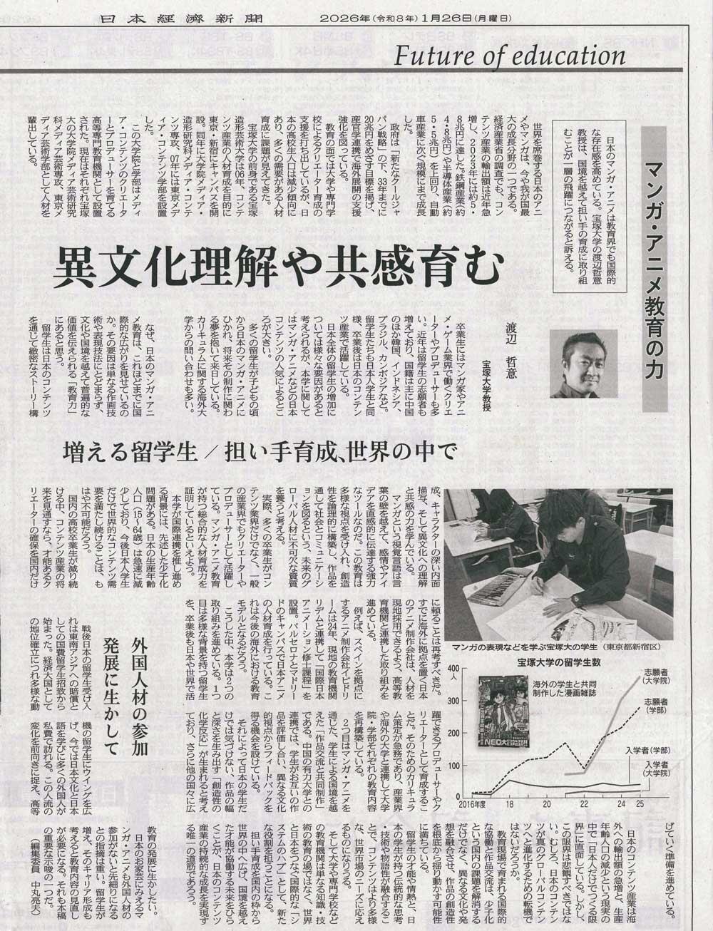 メディアデザイン分野 渡邉哲意教授の寄稿が2026年1月26日(月)付 日本経済新聞に掲載されました。国際的なマンガ・アニメ教育および本学での学習面での取り組みについて書かれています。(教育のあす「日本経済新聞」2026年1月26日(月)付,27面)