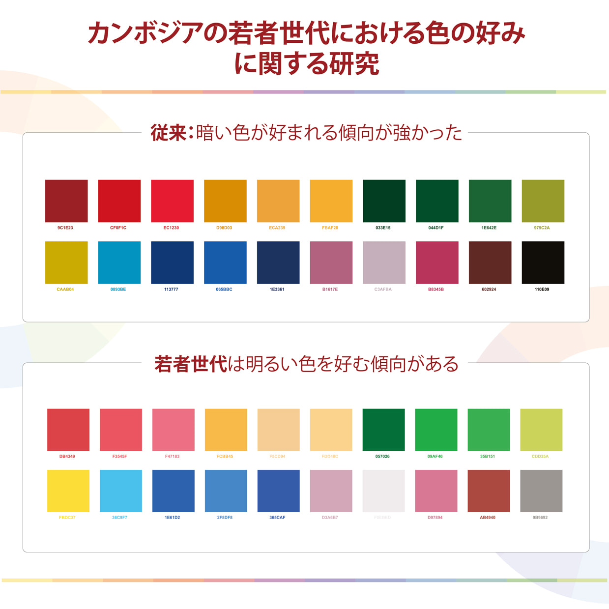 本作品は、カンボジアにおける伝統的な色彩文化と、現代の若者世代の色の嗜好を明らかにし、その特徴を視覚的に示すことを目的として制作したものである。カンボジアでは、かつて植物を原料とした天然染料が使用され、自然界から得られる色は赤・黄・青・黒の4種類に大別されていたとされる。こうした伝統的な色彩文化は、現在のデザインにも影響を与えている可能性がある。カンボジア人が制作したパッケージデザインを調査したところ、赤系統と黄色系統が特に多く使われていることが分かった。また、村に建てられた建物の外観を撮影し色を抽出したところ、多くの建築物でも黄色系統が頻繁に使われていた。これらの画像から抽出した色をグループ分けし、カンボジアの環境に根付くカラーパレットを作成した。さらに、16〜35歳のカンボジアの若者を対象に調査を行った結果、明るい色を好む傾向が一貫して見られた。アンケート項目の一つでは、暗めの色である #D98D03 を選んだ人が 10% にとどまったのに対し、より明るい色である #FCBB45 は 69% の回答者に選ばれた。これらの結果から、若者の間では明るい色への嗜好が特に強いことが示唆される。一方で、環境から抽出した基準色も一定の支持があり、伝統的な色彩と現代的な好みの両方が若者の色選択に影響を与えていることが分かった。作品としては、これらの調査結果に基づき、若者の好む色を視覚化したポスターを制作した。また、既存のパッケージデザインのレイアウトはそのままに、配色のみを変更したバリエーションを複数展開し、同じデザインでも色の違いによって印象がどのように変化するかを比較できるようにしている。