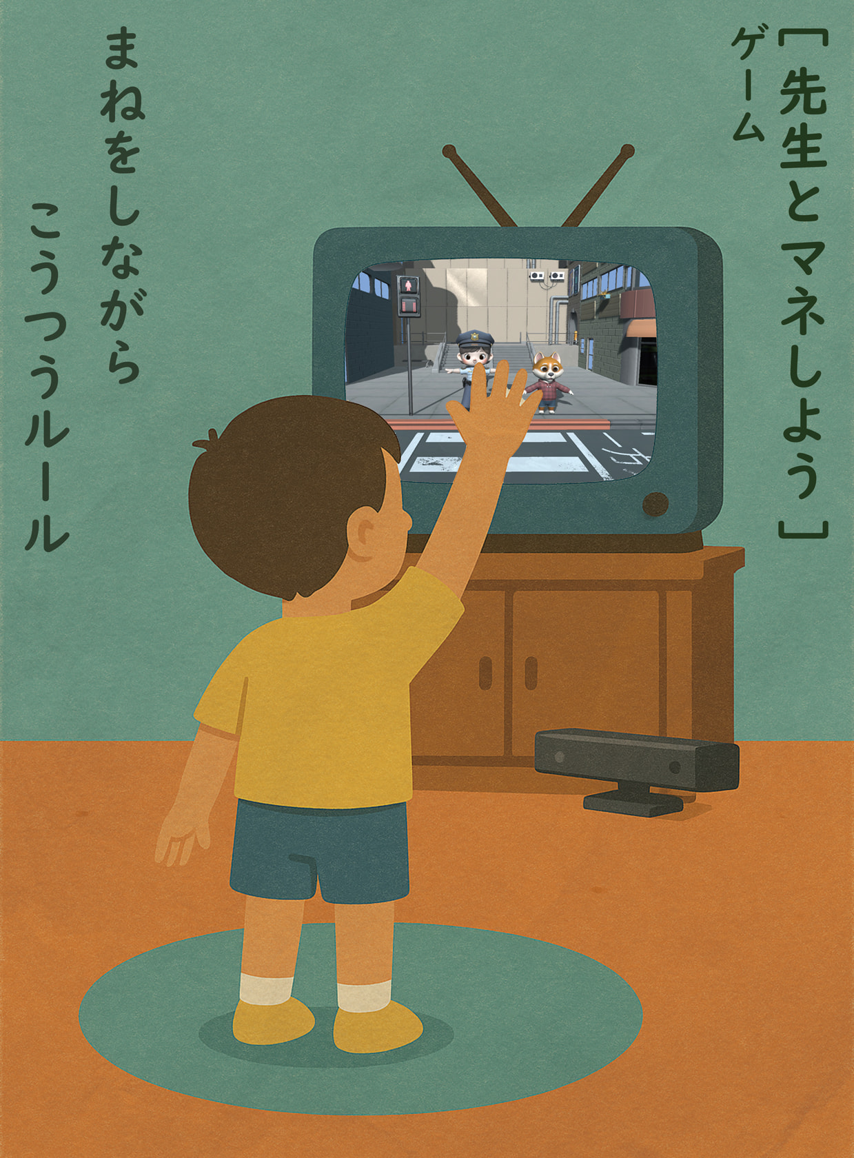 本作品は、幼児を対象とした体感型の知育ゲームである。 「まねをする」という行為に着目し、教師役キャラクターの動作を身体で模倣することで、交通ルールを直感的に理解する体験を設計した。Kinectによる動作認識を用い、手を上げる、左右を確認するなどの基本動作を通して、横断歩道や信号に関する学習を行う。視覚的な説明に加えて身体的な参加を促すことで、エデュテイメントシステム構築を目的としている。