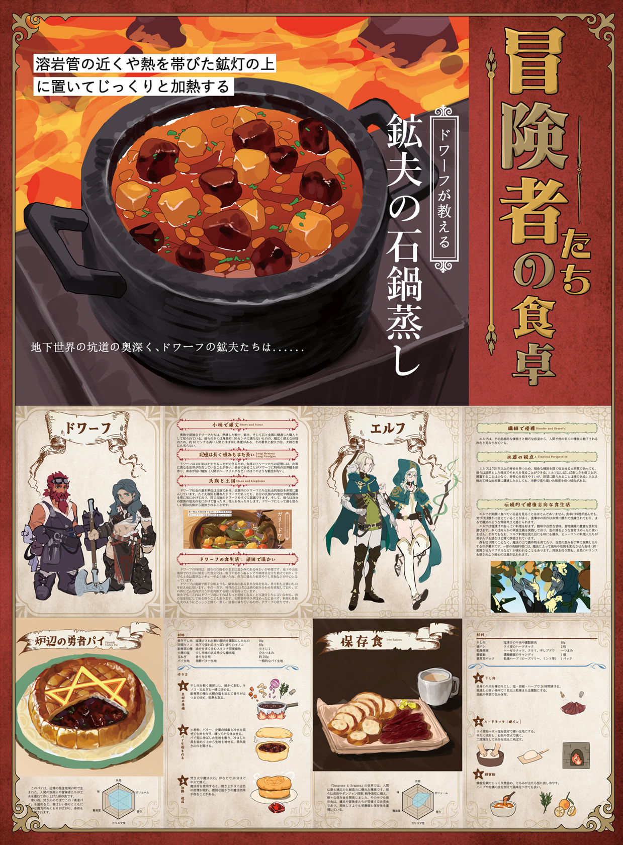 本研究では、『ダンジョンズ&ドラゴンズ(D&D)』を中心とする西洋ファンタジーゲーム作品における食文化要素の不足に着目し、世界観と没入感を補完することを目的として、種族ごとの食文化の再構築を試みる。『D&D』に登場する種族の特徴を踏まえて食文化を紹介する45ページのレシピ本『冒険者たちの食卓』を作成する。紙冊子版と共に電子版を制作し、アニメーション効果、サウンドエフェクトを加える。研究成果を活用し、ファンタジー世界の食文化に新しいリアリティと魅力を付与することを意図している。