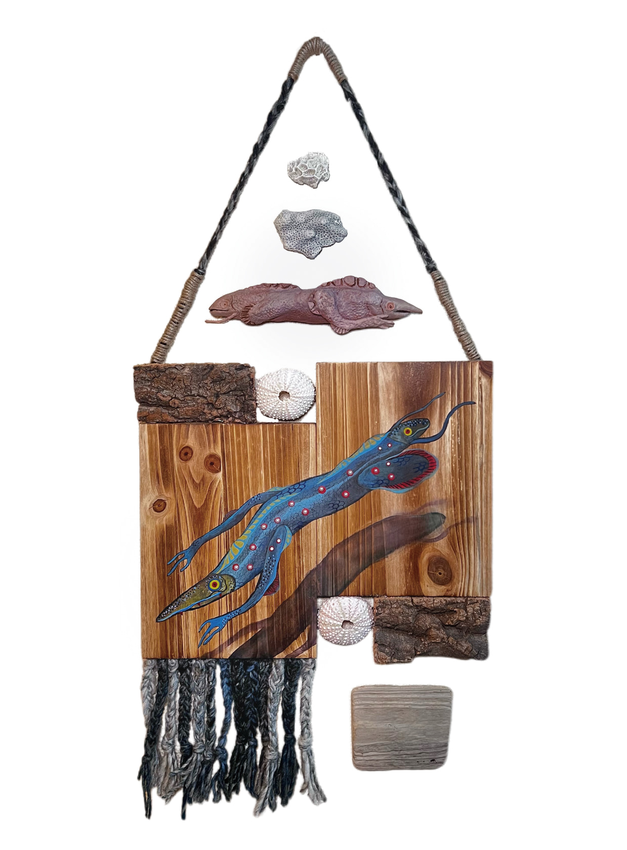 本作は、海洋生物をモチーフに創作された四種類のキメラを題材としたイラストレーション研究です。古代ギリシア神話におけるキメラの起源を踏まえつつ、実在する海洋生物の形態を参照し、それらの特徴を融合して新たなキメラを創造しました。本展示では、四種類のキメラをテーマとした2点の立体作品と4点の平面作品を発表します。立体作品では、「双頭類キメラの化石箱」と「甲殻類キメラの人工飼育標本」制作し、平面作品では、四種類のキメラの生態を海洋生物として視覚的に表現しています。