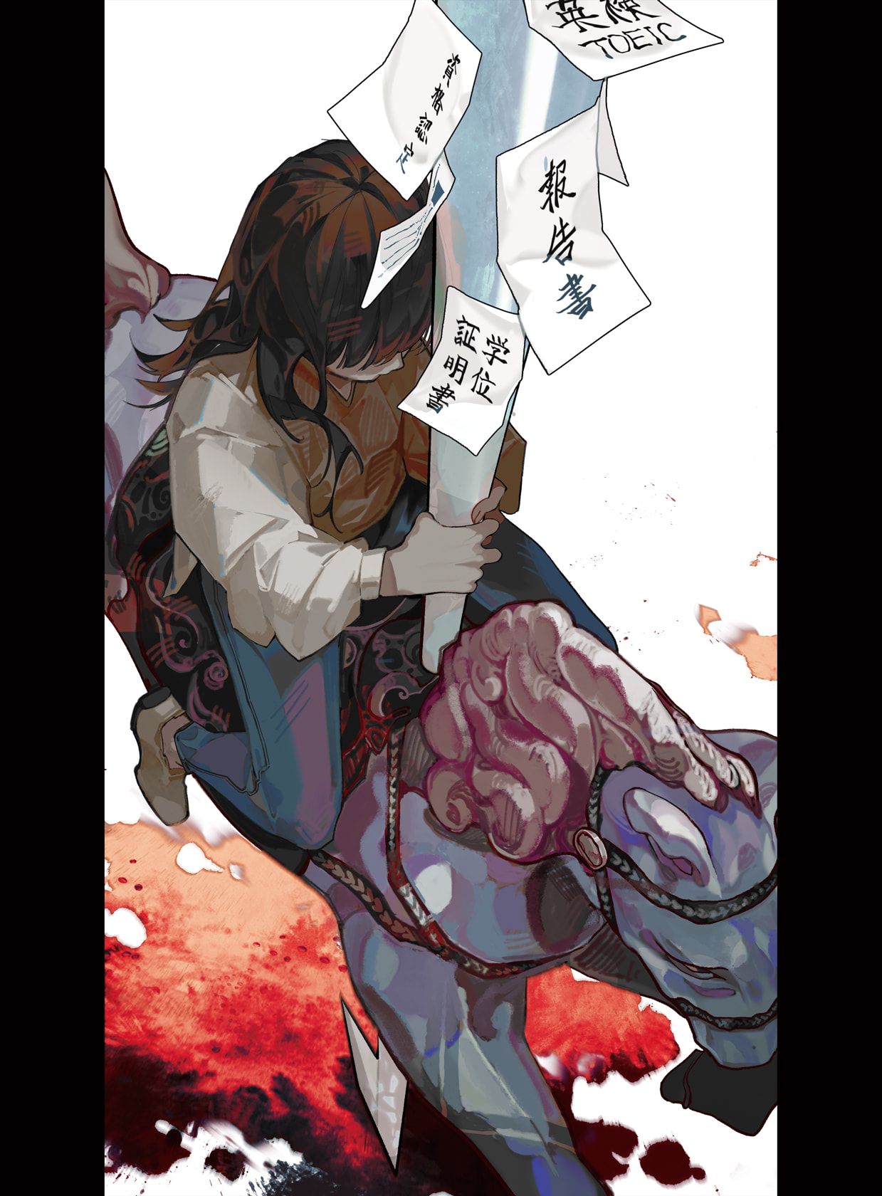 本作品は、視覚的隠喩を用いて、成長に伴う夢の喪失と現実社会との衝突を描いたものである。かつて回転木馬の支柱であった一本の棒は、少女の手の中で血に染まった槍へと変質し、幼少期の幻想が社会の厳しさによって形を変えてしまう過程を象徴している。社会に足を踏み入れた大人は、その複雑さや競争の残酷さゆえに、かつての夢を保つことが難しくなる。本作では、少女がその槍を振り下ろす姿を通して、外界の圧力により自らの夢を「断つ」瞬間を視覚的に示した。隠喩構造により、夢と現実の断絶や成長の痛みを多層的に読み取れる表現を目指している。