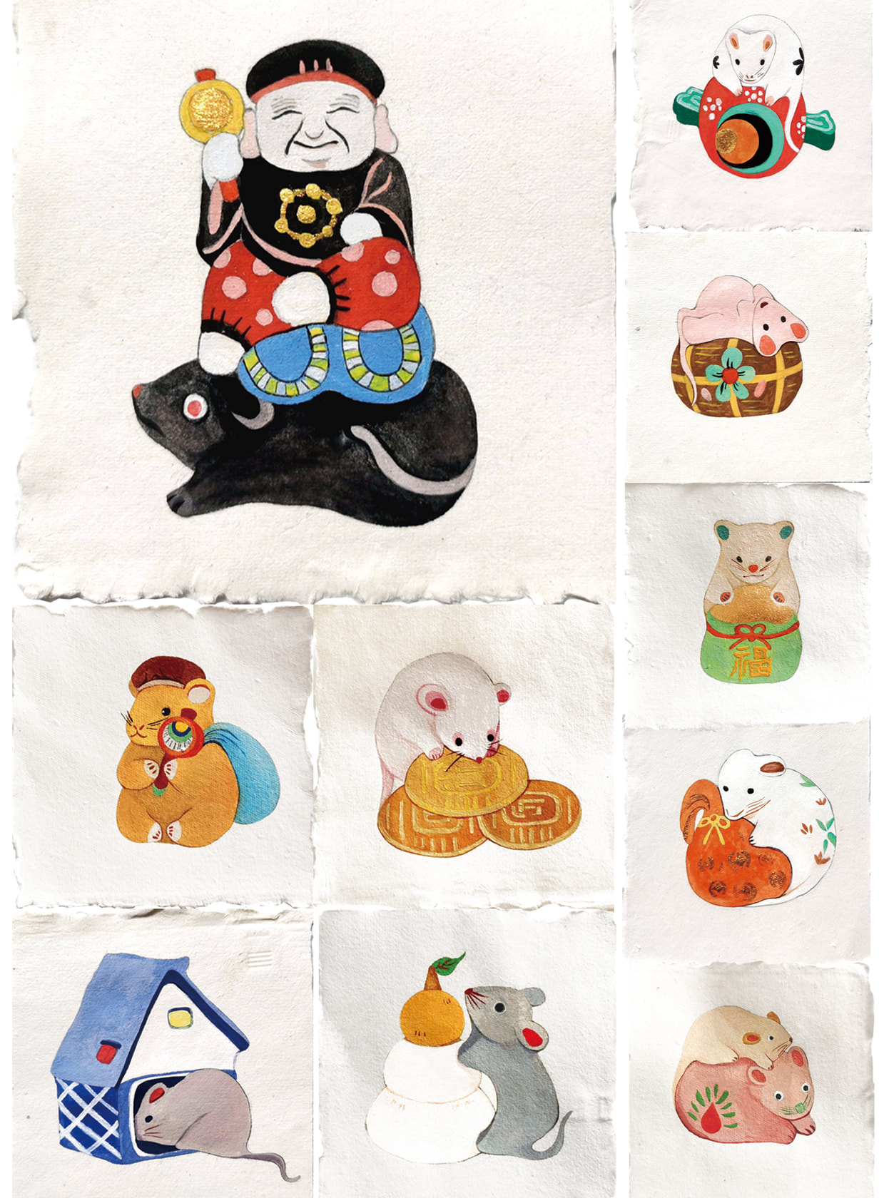 本作品は十二支の動物をモチーフにした郷土玩具のイラストレーショ作品研究です。十二支動物の代表的な縁起の良い物と良い意味や祈りをイラストレーションの中で表現しています。その祈り、神様とつながっていて具象化の郷土玩具の特徴の上で新たな発想を加えて、かわいくて簡単な形で新たな張り玩具の形を創作しました。イラストレーション作品は120枚で、各動物10枚ずつとなります。さらに、イラスト作品とともに12点の立体作品を制作しました。このシリーズの作品を通して、人々に祝福を届けて、縁起物の魅力を伝えます。